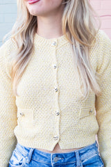 Brighten up your wardrobe with the Priscilla Gold Button Cardigan in sunshine yellow. This playful cropped cardigan features a chic round neck and long sleeves, perfect for layering or wearing on its own. The eye-catching gold buttons add a fun touch of elegance to any outfit, making it a delightful choice for adding warmth and style to your day!