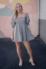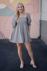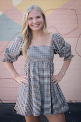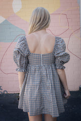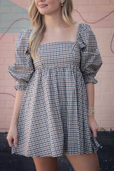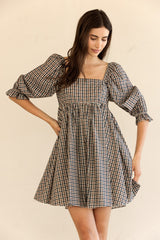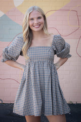 Turn heads in the Rumi Square Neck Plaid Mini Dress, featuring charming half puff sleeves and a flattering square neckline. Its playful navy and brown plaid pattern pairs perfectly with the mini length, while the back zipper ensures easy wear. Ideal for adding a fun, flirty vibe to any outing!