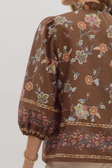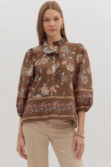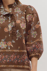 The Sasha Floral Top brings a dash of botanical charm to your everyday rotation. This playful piece features eye-catching printed florals that pop against a rich brown base, while delicate ruffle detailing at the neckline adds a touch of whimsy. The three-quarter sleeves are finished with elastic cuffs for a polished fit, and functional buttons provide both style and practicality. Perfect for layering or wearing solo, this top effortlessly transitions from casual outings to weekend adventures with personality to spare.