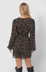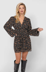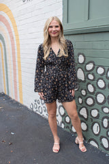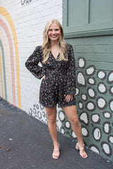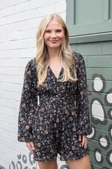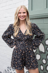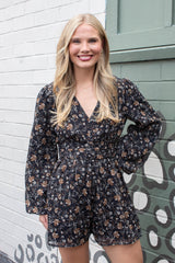 Embrace effortless charm with this playful romper featuring a ruched waist and an elastic smocked back for a perfect fit. Its floral print and long sleeves add a flirty, feminine touch, while the V-neck and back button closure keep things cool and easygoing. Ideal for sunny days or breezy evenings, this romper combines comfort with style in a delightful black multi palette!