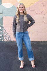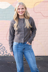 Cozy meets chic in the Vivian Round Neck Side Slit Cardigan, Mocha. This playful piece features long sleeves and a button-front design perfect for layering. Side slits add a flirty twist, while ribbed hem and cuffs keep you snug and stylish all day long. Ideal for those who love comfort with a little flair!