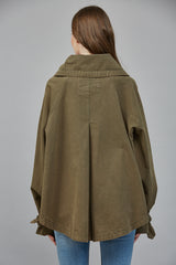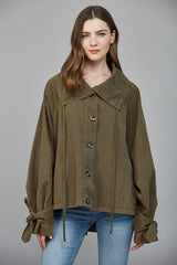 The Willow Washed Jacket in Olive combines effortless style with thoughtful design details. This button-down jacket features a distinctive curved panel and asymmetrical hem that creates visual interest, while long sleeves and a drawstring collar offer adjustable comfort. Knotted sleeve cuffs add a modern touch, and functional side pockets keep essentials within reach. The washed finish gives it a relaxed, lived-in appeal perfect for layering through any season.