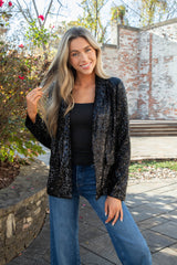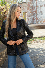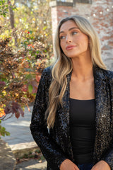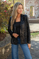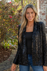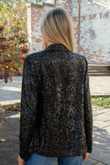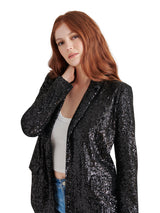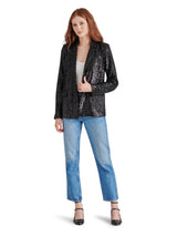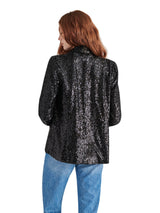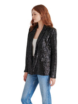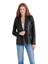 Shine on with the Payton Sequin Blazer by Steve Madden. This black blazer with sequin detailing will add a touch of glam to any outfit. With a collared neckline and open front, pair this blazer with faux front pockets and padded shoulders for a statement-making look!