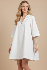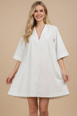 Effortlessly chic and ready for anything, the Hallie Mini Dress brings playful sophistication to your wardrobe. This crisp white piece features a flattering V-neckline and classic collar that frame your face beautifully, while eye-catching contrast stitching adds a fun, modern twist. The mini silhouette keeps things breezy and bold—perfect for dressing up or down. Whether you're heading to brunch or a night out, this dress delivers style with a wink and a smile.