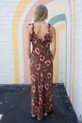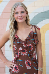 Step into sunshine with the Adalina Floral Ruffled Maxi Dress in a charming brown hue. This playful dress features a sweet floral print, flirty ruffled accents, and a flattering V-neckline. Thin tie straps add a touch of whimsy, while the flowing maxi length lets you twirl with ease. Perfect for an event or weekend fun, it’s a delightful way to brighten your day!