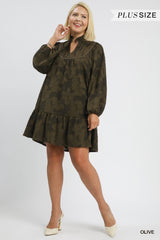 The Arlette Jacquard Ruffle Detail Dress in olive brings playful charm to your wardrobe with its delicate jacquard floral print and flirty ruffled neck and hem. Long bubble sleeves add a whimsical touch, while the split V-neck and pintuck details create a flattering silhouette. This dress is perfect for twirling through your day with effortless style and confidence!