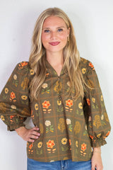 Brighten your wardrobe with the Emilia Floral Print Top in olive. Featuring charming three-quarter puff sleeves and delicate ruffled neck and cuffs, it offers a playful, romantic vibe. The split V-neck and button detail front add flirty touches, perfect for mixing and matching your favorite bottoms. Embrace fun, feminine style effortlessly!