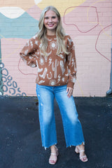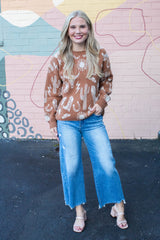 Embrace cozy charm with the Halle Western Graphic Oversized Sweater in warm camel. Featuring a roomy crew neckline and long balloon sleeves, it wraps you in playful comfort all day. The rolled hem adds a casual, effortless vibe perfect for layering or solo wear. This sweater is your go-to for relaxed style with a western twist!