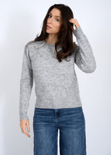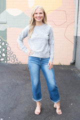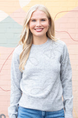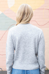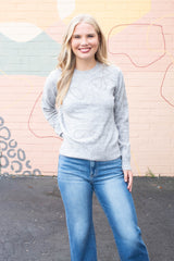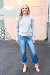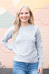 Add a touch of sparkle to your cozy days with the Ginevra Rhinestone Bow Sweater. This light grey melange knit features playful rhinestone bow details that shine just right, while the ribbed hem, cuffs, and crew neckline keep you snug and stylish. With long sleeves perfect for layering or solo wear, it’s an effortlessly charming addition to any casual wardrobe!