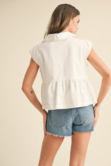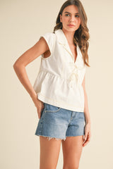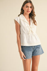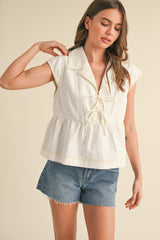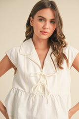 This snow denim top features a quirky collared design with a playful v-neck and babydoll style. The tie front adds a touch of charm, while the contrast stitching brings a unique twist. Stay stylish and casual with this one-of-a-kind top!