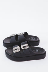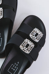 Step up your sandal game with the Lola Flatform Crystal Buckle Sandal from ShuShop! The 1.5-2" platform adds height and the crystal buckle embellishments add a touch of sparkle. With two buckle closures, these slides are easy to slip on and off. Perfect for adding a little extra flair to any outfit!