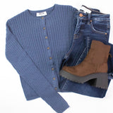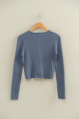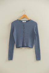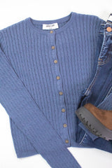 This playful cable knit cropped cardigan in dusty navy is your new go-to for layering fun. Featuring a button-down front, round neck, and long sleeves, it adds a cozy yet stylish touch to any outfit. Perfect for those days when you want a little extra warmth with a lot of charm!