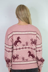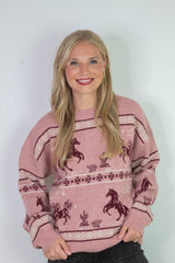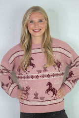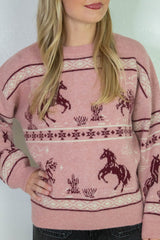 Embrace cozy charm with the Skylar Oversized Western Print Sweater in mauve. This playful piece features eye-catching western graphics, long balloon sleeves for an extra touch of fun, and bold stripe details that keep things lively. The classic crew neckline balances the relaxed fit, making it perfect for layering and laid-back days with a stylish twist!