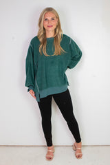 Stay cozy and stylish in the Millie Oversized Crewneck Sweatshirt. Crafted from soft fleece, it offers a comfy, oversized fit with playful raw edge details and side slits for extra flair. The ribbed hem and cuffs keep it snug, while the classic crew neckline and long sleeves make it perfect for layering or lounging around. This dark green sweatshirt brings effortless cool to your casual wardrobe!