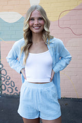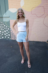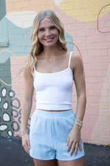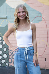 Get ready to turn heads with the quirky and fun Adelaide Ribbed Crop Cami! This white cropped top features ribbed detailing, spaghetti straps, and a round neck for a playful and stylish look. Perfect for any occasion, this solid colored cami is a must-have for your wardrobe. So go ahead, rock that crop!