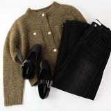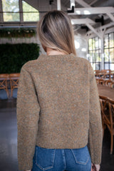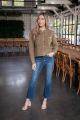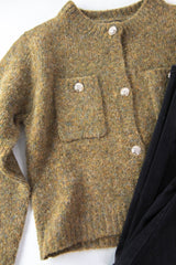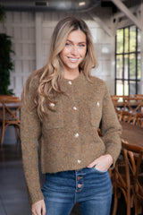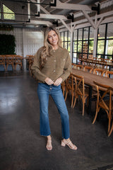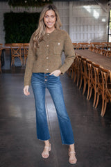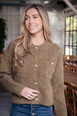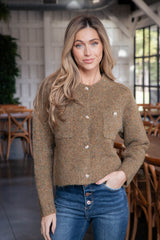 Introducing our Delanie cardigan, featuring a playful button down design with quirky button detail chest pockets. Made with cozy boucle fabric, this olive cardigan is perfect for snuggling up on chilly days. Complete with a round neck and long sleeves!