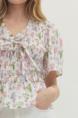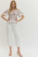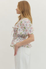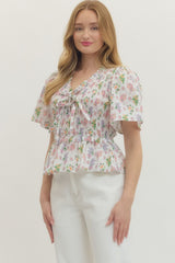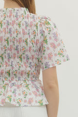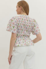 Flirty and fun, this smocked peplum top brings instant personality to your wardrobe. The fitted smocking detail creates beautiful texture across the bodice, while the playful printed pattern adds visual interest. Short sleeves keep things breezy and comfortable, and the peplum hem gives you that extra dose of sass with a flattering silhouette. Perfect for dressing up casual looks or adding movement to your everyday style.