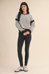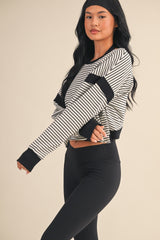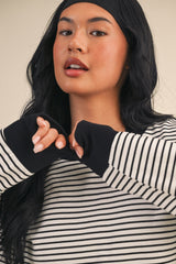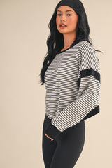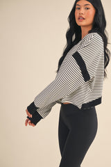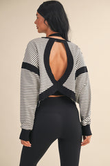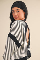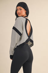 Meet your new favorite layering piece—the Kenzie Striped Sweatshirt is here to shake things up. Rock those crisp white and black stripes with a daring cut-out back that says you've got style to spare. The long sleeves keep you cozy while contrast detailing adds just the right amount of edge. Whether you're layering it up or letting that back detail steal the show, this sweatshirt is ready for whatever you throw at it.