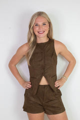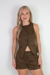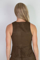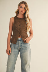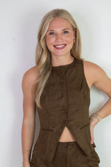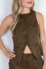 Elevate your layering game with the Liliana Button Front Suede Vest in Dark Oak. This sleeveless beauty features a playful tie-back detail and faux notch pockets for a fun twist. The round neck and subtle seam details add a touch of charm, making it perfect for adding texture and warmth without the bulk. Perfect for mixing and matching, this vest brings a cozy, stylish vibe to any outfit!