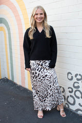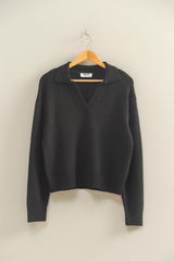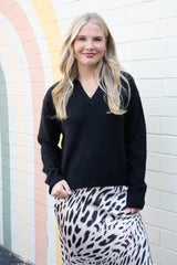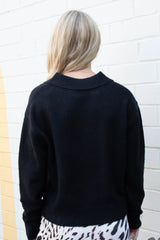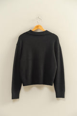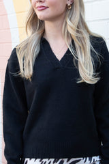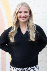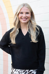 Bring a touch of charm to your wardrobe with the Luna Collared V-Neck Sweater in black. Featuring a flirtatious V-neck and classic collar, this sweater balances playful style with cozy long sleeves. The ribbed hem and cuffs add just the right amount of snug comfort to keep you feeling cute and cozy all day long. Perfect for layering or wearing solo, Luna’s ready to brighten your look with effortless flair!