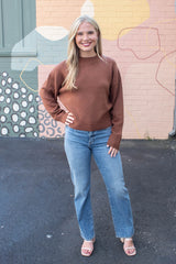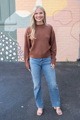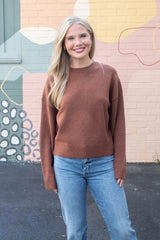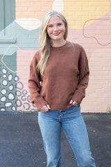 Stay cozy and stylish with the Madeline Pullover Crewneck Sweater in warm chestnut. Featuring a classic crew neckline, long sleeves, and ribbed hems and cuffs, this sweater wraps you in comfort while keeping your look effortlessly cool. Perfect for layering or wearing solo on crisp days!