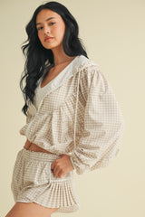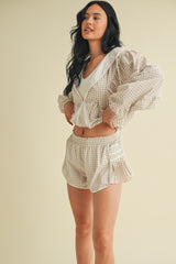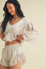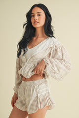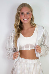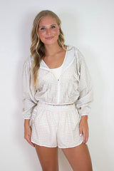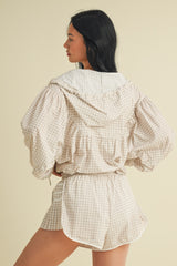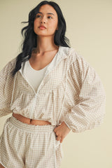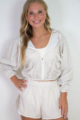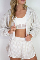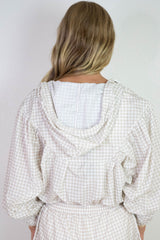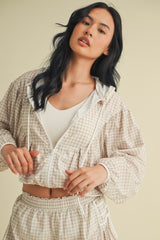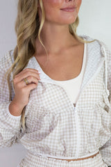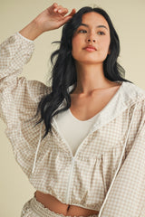 Stay breezy and stylish in the Marin Lightweight Gingham Print Jacket. This cropped jacket features a charming beige gingham pattern, a zip-up front, and a playful drawstring hood for adjustable comfort. Long sleeves and an elastic hem keep the fit snug while adding a fun, flirty touch to your look. Perfect for layering on those cool, sunny days!
