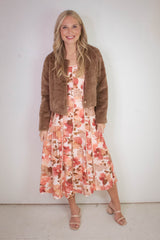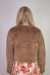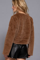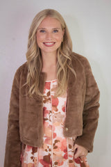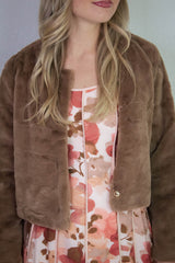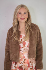Wrap yourself in fun and flair with the Martha Faux Fur Crop Blazer in Mocha! This cozy, cropped blazer boasts soft faux fur, a flattering round neck, and long sleeves to keep you snug. The gold buttons add a pop of sparkle, making every outfit instantly more playful and polished. Perfect for those who love a little luxe with a wink!