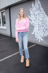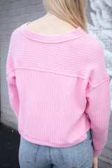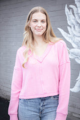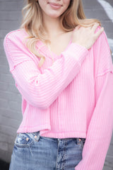 This ribbed top is all about the details, from the drop shoulders to the raw and exposed seam accents. With a stylish V-neck and long sleeves, this top offers a comfortable and fashionable fit. Perfect for adding a bit of edge to your wardrobe!