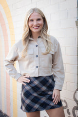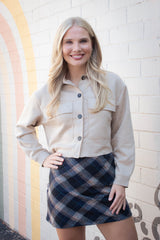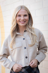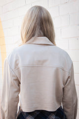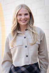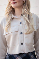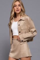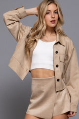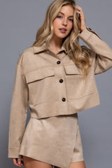 This Monet Faux Suede Short Jacket in Sand Taupe brings a fresh twist to your wardrobe with its buttery-soft faux suede and trendy cropped cut. The playful raw edges and chest pockets add charming details, while the button closure and classic collar keep things effortlessly cool. Perfect for layering, this jacket combines comfort and style in one irresistible package!