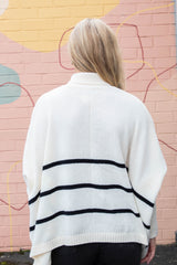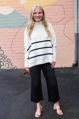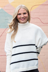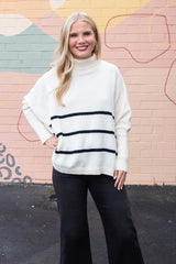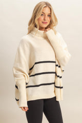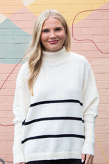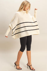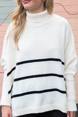 Cozy up in the Myra Striped Turtleneck Sweater, featuring bold black stripes for a fresh twist on classic warmth. Its oversized fit and long dolman sleeves make it perfect for layering or lounging with extra comfort and style. Embrace warmth with a playful edge in this easygoing yet striking sweater!