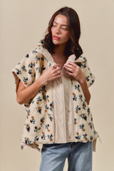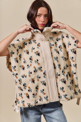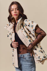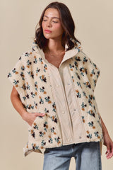 Cozy meets cute in the Naomi Floral Oversized Sherpa Vest. The soft ivory sherpa is accented with playful nylon contrast and a vibrant floral print, bringing warmth and style together. Snap button closure and a mock neck keep you snug, while side pockets and slits with ties add a touch of effortless cool. Perfect for layering on chilly days with a fun, flirty vibe!