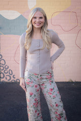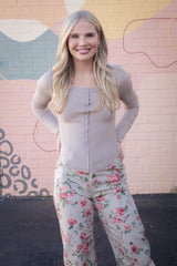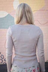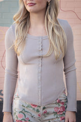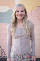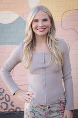 Cozy meets cute in this Opal Waffle Knit Snap Button Top in warm Mocha. The textured waffle knit keeps things comfy, while the snap button front adds a fun twist to your layering game. Long sleeves and a scoop neck make it easy to wear solo or under your favorite jacket. Thoughtful seam details bring subtle style to every move. Perfect for playful days and relaxed vibes!
