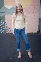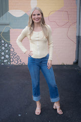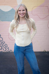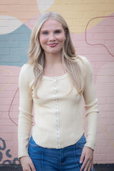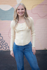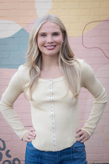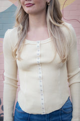 Cozy meets cute in this Opal Waffle Knit Snap Button Top in warm Yellow. The textured waffle knit keeps things comfy, while the snap button front adds a fun twist to your layering game. Long sleeves and a scoop neck make it easy to wear solo or under your favorite jacket. Thoughtful seam details bring subtle style to every move. Perfect for playful days and relaxed vibes!