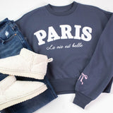 Bring a playful vibe to your outfit with the Paris Bow Embroidered Fleece Sweatshirt in dusty indigo. This cropped sweatshirt features long sleeves and a classic crew neckline for cozy comfort. The charming white and light pink bow embroidery adds a fun graphic touch, making it a perfect piece to brighten up your casual style!