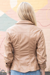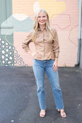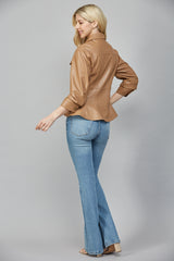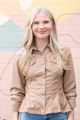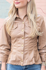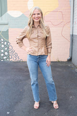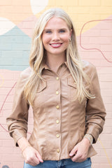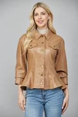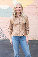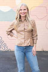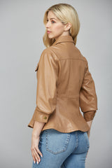 Elevate your look with the Penelope Faux Leather Peplum Jacket in camel. Playful cinched three-quarter sleeves and a ruffled peplum hem add fun flair, while chest pockets and snap button front bring cool, casual vibes. Finished with a classic collar and eye-catching seam details, this jacket pairs effortlessly with your favorite jeans or skirts!