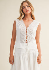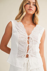 Effortless charm meets modern style with this sleeveless top that's equal parts sweet and sophisticated. The eyelet detailing adds a delicate touch, while the ribbed jersey fabric keeps things comfortable and flattering. The standout bow tie front is your instant style upgrade—tie it snug for a polished look or keep it loose and relaxed for weekend vibes. Perfect for layering or wearing solo, this mixed-fabric piece transitions seamlessly from brunch to evening plans.
