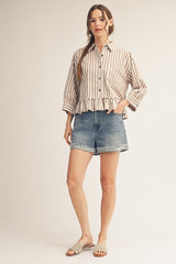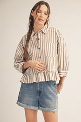 Elevate your everyday style with the Penny Ruffled Hem Stripe Shirt in warm mocha tones. This charming piece features a playful ruffle hem that adds movement and personality, paired with crisp pleating for a polished silhouette. The classic stripe pattern keeps things fresh and versatile, making it perfect for mixing and matching with your favorite pieces. Whether you're dressing up for brunch or keeping it casual, this shirt brings a touch of whimsy and sophistication to any outfit.