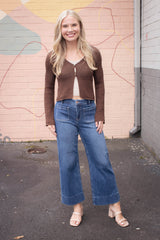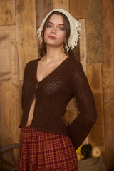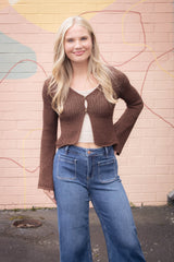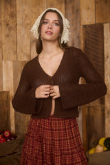 Add a touch of whimsy to your wardrobe with the Quinn Bell Sleeve Crocheted Cardigan in Brown. Featuring playful long bell sleeves and a breezy open-knit design, this cropped cardigan buttons up with a flattering V-neckline. Perfect for layering over your favorite tops, it brings effortless charm and a cozy vibe to any outfit!