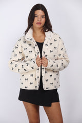 Wrap yourself in cozy charm with this delightful sherpa jacket that's equal parts sweet and sophisticated. The adorable bow detail adds a playful touch, while the classic button-down closure keeps things polished and put-together. Practical slanted front pockets mean you've got somewhere to stash your essentials—or just your hands when you need a little extra warmth. The cream and black colorway strikes the perfect balance between timeless and trendy, making it an instant favorite for layering over everything in your closet.