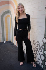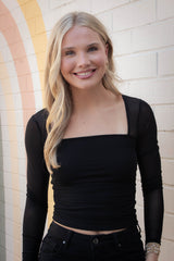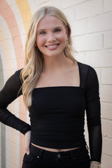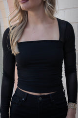 Elevate your style with the Skylar Ruched Waist Square Neck Top in classic black. Featuring a flattering ruched waist and sides that hug your curves just right, this top adds a fun twist to your everyday look. The chic square neckline and long sleeves bring a touch of elegance, making it perfect for day-to-night adventures. Playful yet polished, it’s a versatile piece that’s ready to turn heads wherever you go!