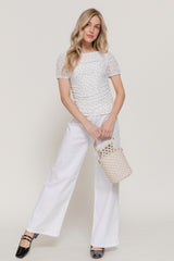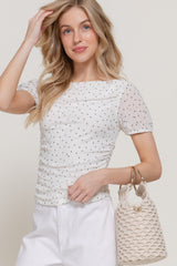 Bring a touch of whimsy to your wardrobe with this charming mesh top! Featuring delicate dot print detailing and playful puff sleeves that add instant personality, it's the perfect piece for mixing and matching. The shirring detail creates a flattering fit while the airy mesh fabric keeps things light and breezy. Whether you're dressing it up or keeping it casual, this black and white beauty is ready for anything.