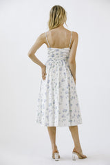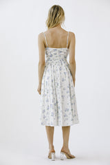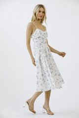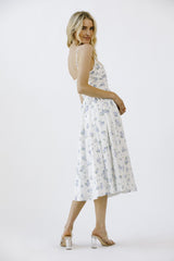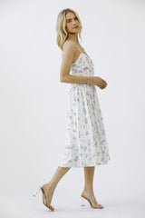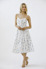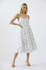 Get lost in a garden of style with our Miller Rose Print A-Line Dress. This white and blue floral number boasts a midi length, sweetheart neckline, and adjustable spaghetti straps for a flirty touch. The ruffle details and back zipper closure add playful flair as well. Perfect for any occasion!
