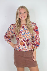 Add a dash of charm with the Adele Printed Button Down Blouse in Cream Rust. Featuring playful three-quarter sleeves, a flattering tie waist, and a classic button front, this blouse brings effortless style to your day. The round neck and subtle seam details add just the right touch of detail to keep things interesting. Perfect for those who love a chic, comfortable look with a little twist!