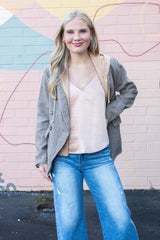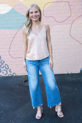 Slip into the Averie Lace Trim Satin Cami in Almond for a touch of effortless charm. With its silky satin fabric, playful lace trim, and flattering V-neck and back, this cami dances beautifully on your skin. The round hem adds a flirty finish, perfect for layering or wearing solo on sunny days. Embrace chic comfort with a fun twist!