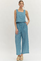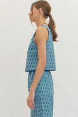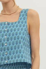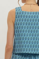 The Carter Printed Crop Top in blue combines comfort with contemporary style. Crafted from 100% cotton with a polyester-cotton blend lining, this sleeveless top features a striking printed design. Perfect for layering or wearing solo, it's an easy addition to any wardrobe. Hand wash cold and line dry to maintain its quality and vibrant print.
