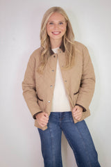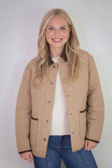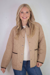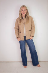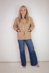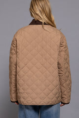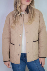 Stay cozy and stylish in the Cleo Quilted Puffer Work Jacket. Featuring a playful contrast lapel collar and practical button-down front, this khaki jacket is made for work and weekend adventures. Quilted for warmth and equipped with handy front pockets, it’s your go-to for staying comfy without sacrificing cool!