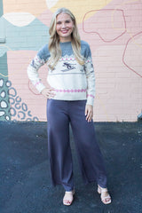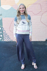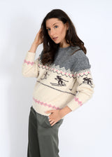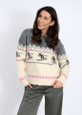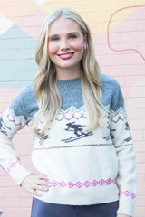 Stay cozy and stylish on the slopes or in the lodge with the Gunhild Ski Print Sweater. This grey pullover features a fun ski-inspired pattern, a comfy crew neckline, and long sleeves perfect for layering or wearing solo. It’s your new go-to for chilly days when you want warmth without sacrificing flair!