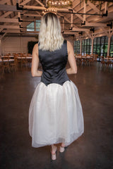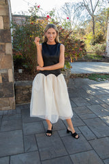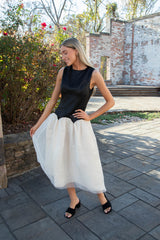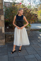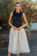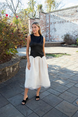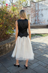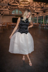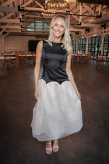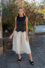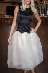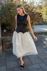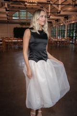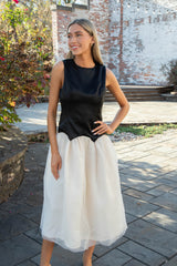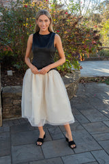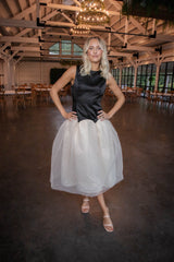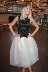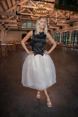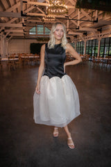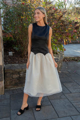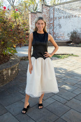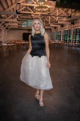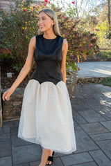 Get ready to turn heads in our Joyce Low Waist Midi Dress! Featuring a low waist and playful scallop detail top, this black and ivory dress adds a touch of fun to any look. The tulle bottom and midi length give you a flirty silhouette, while the sleeveless design and round neck keep you feeling cool and comfortable. The back zipper closure ensures a perfect fit every time!
