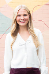 Add a touch of sparkle to your look with the Marie Sparkly Bow Cardigan in cream. Featuring a dazzling rhinestone bow detail and a clever hidden double snap closure, it's as charming as it is practical. Playful long balloon sleeves and a flattering V-neckline make it perfect for layering with your favorite outfits while turning heads wherever you go!
