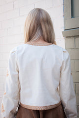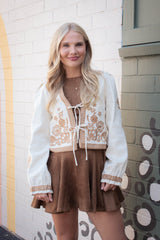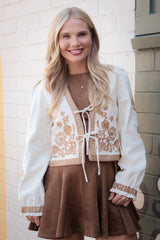 Add a touch of charm to your wardrobe with the Mia Embroidered Front Tie Jacket in soft ecru. Featuring delicate embroidery, a flattering V-neck, and cozy long sleeves, this jacket brings playful elegance to any outfit. Its front tie adds a fun twist, making it perfect for layering on breezy days while keeping your style effortlessly cute!